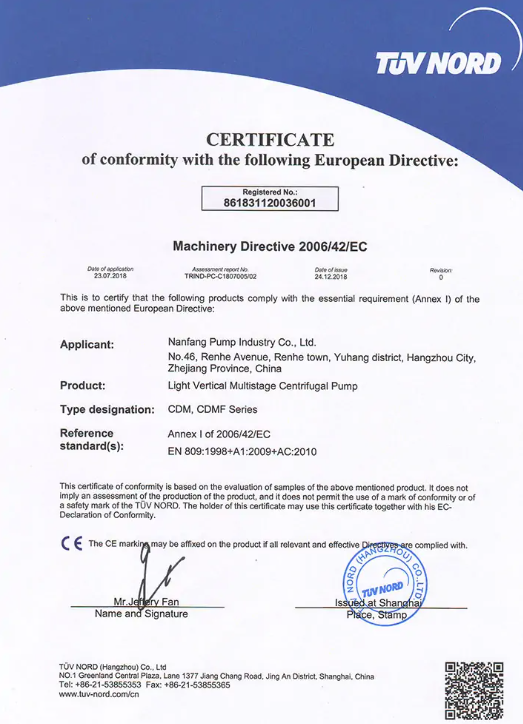 ปั๊มน้ำแนวตั้งหลายใบพัด CNP ผลิตจากโรงงานที่ได้มาตรฐาน ISO, TUV NORD ซึ่งเป็นมาตรฐานระดับโลก อีกทั้งยังผ่านการตรวจสอบคุณภาพขั้นสุดท้ายก่อนออกจากโรงงานทุกตัว